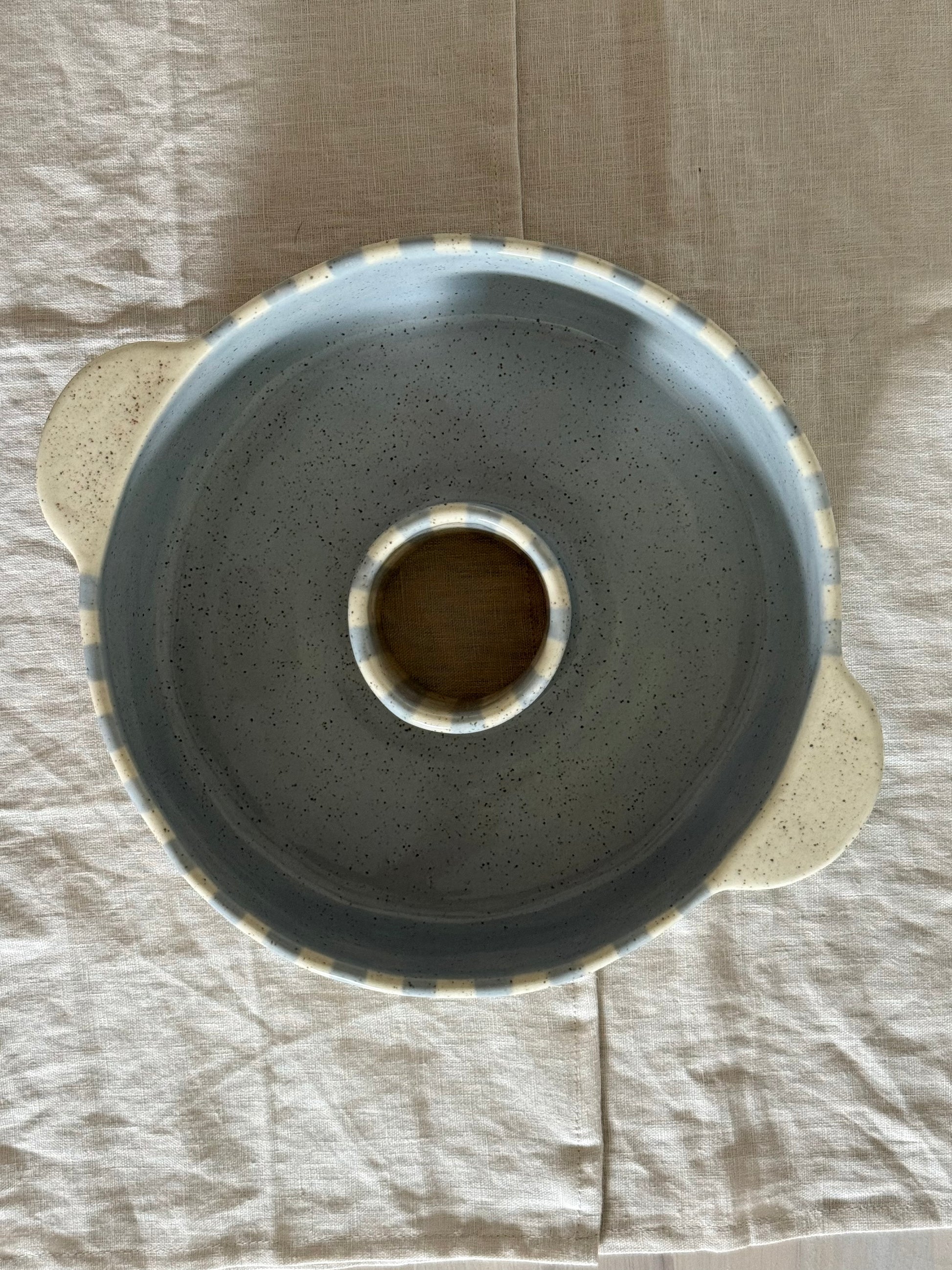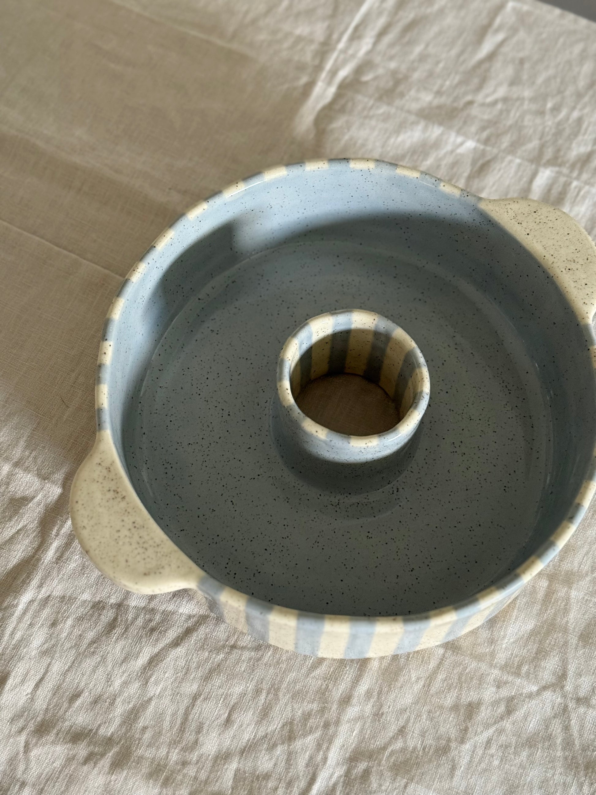 Finished in soft blue and cream tones with a glossy glaze. The round form and center ring create an even bake, while the smooth surface makes it easy to release and serve. Designed with gentle stripes and a simple handmade look that fits nicely into any kitchen.