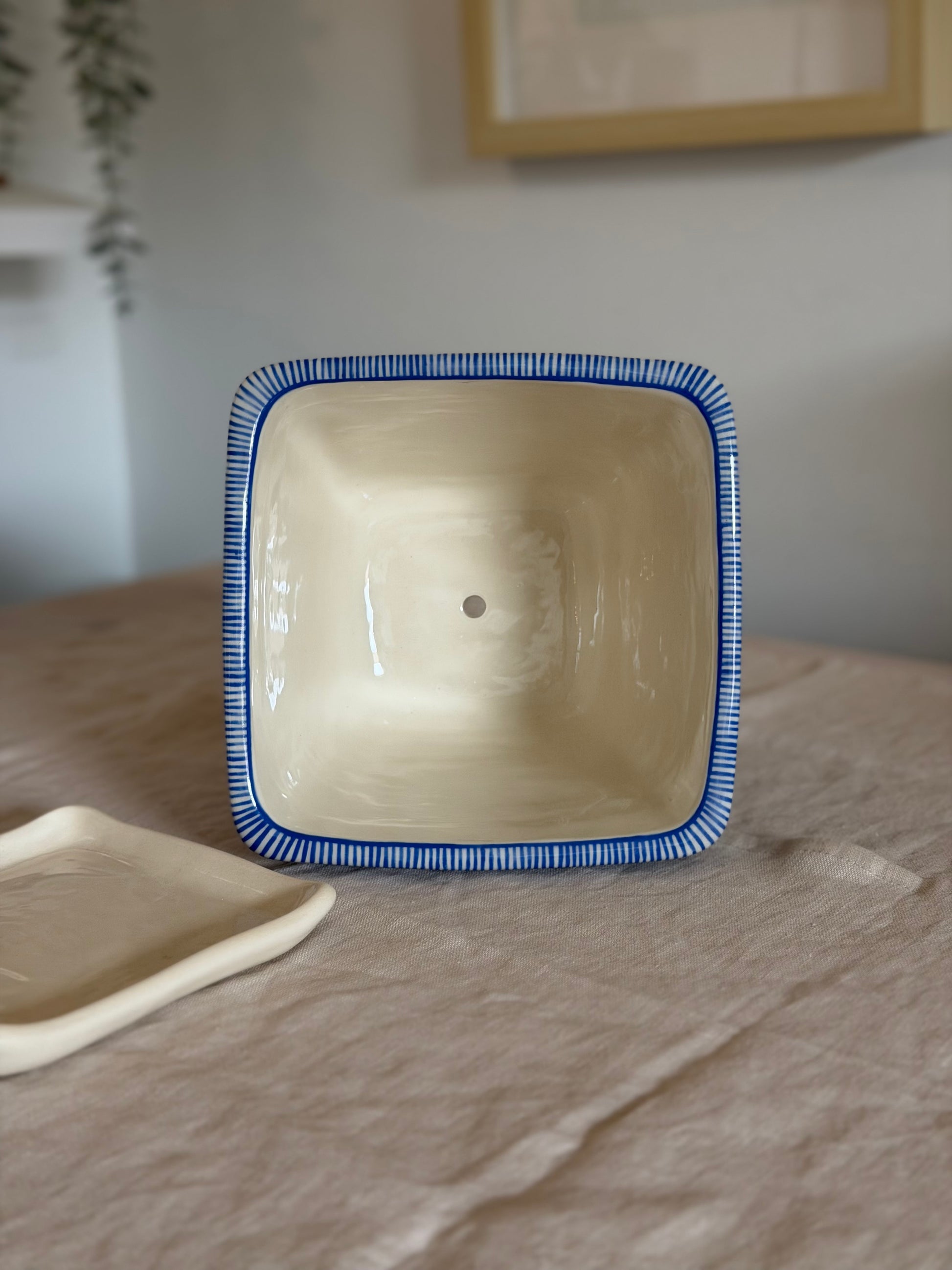 A handmade ceramic planter with a bold blue and white checker pattern and fine striped rim. The square shape sits on four small feet, paired with a matching tray to catch extra water.