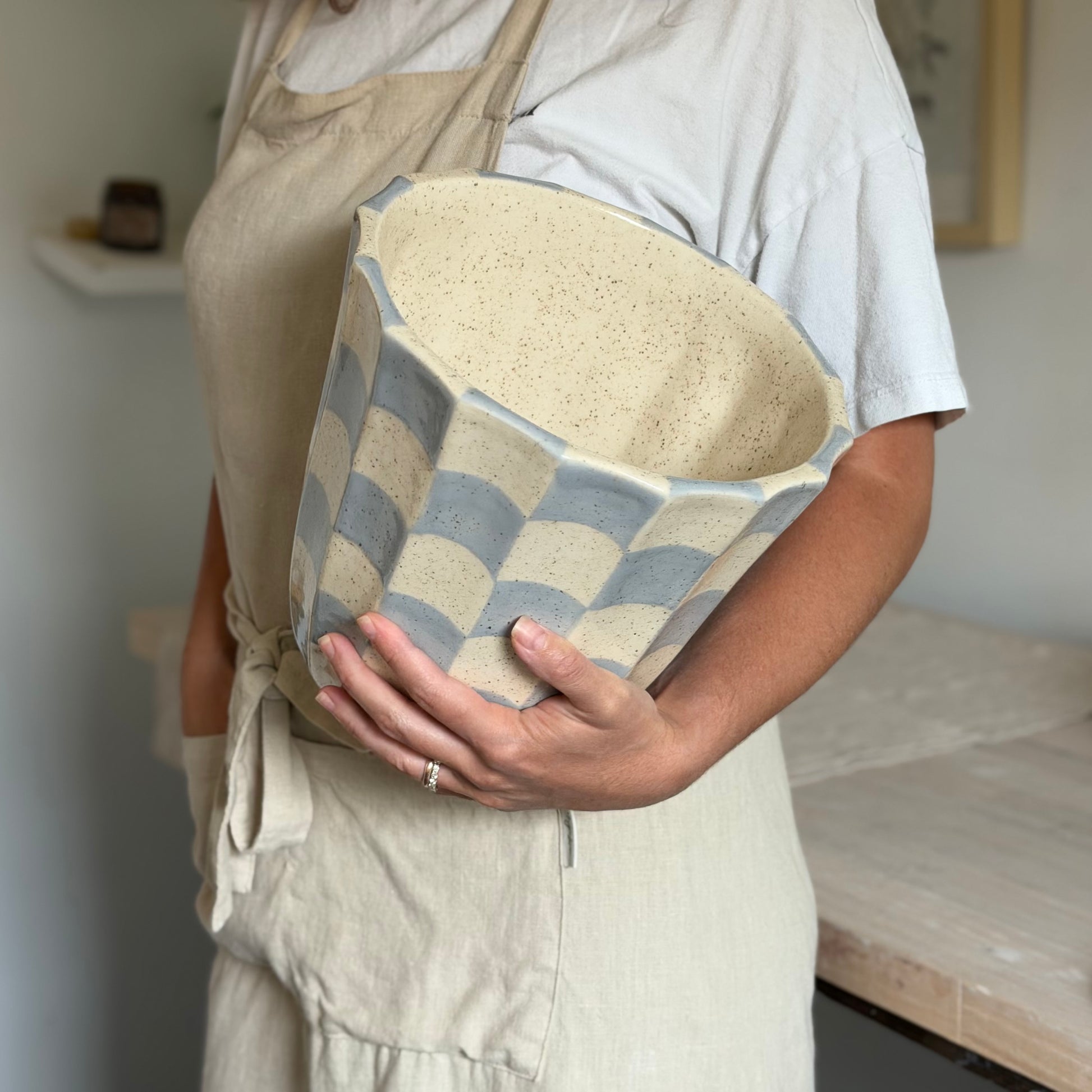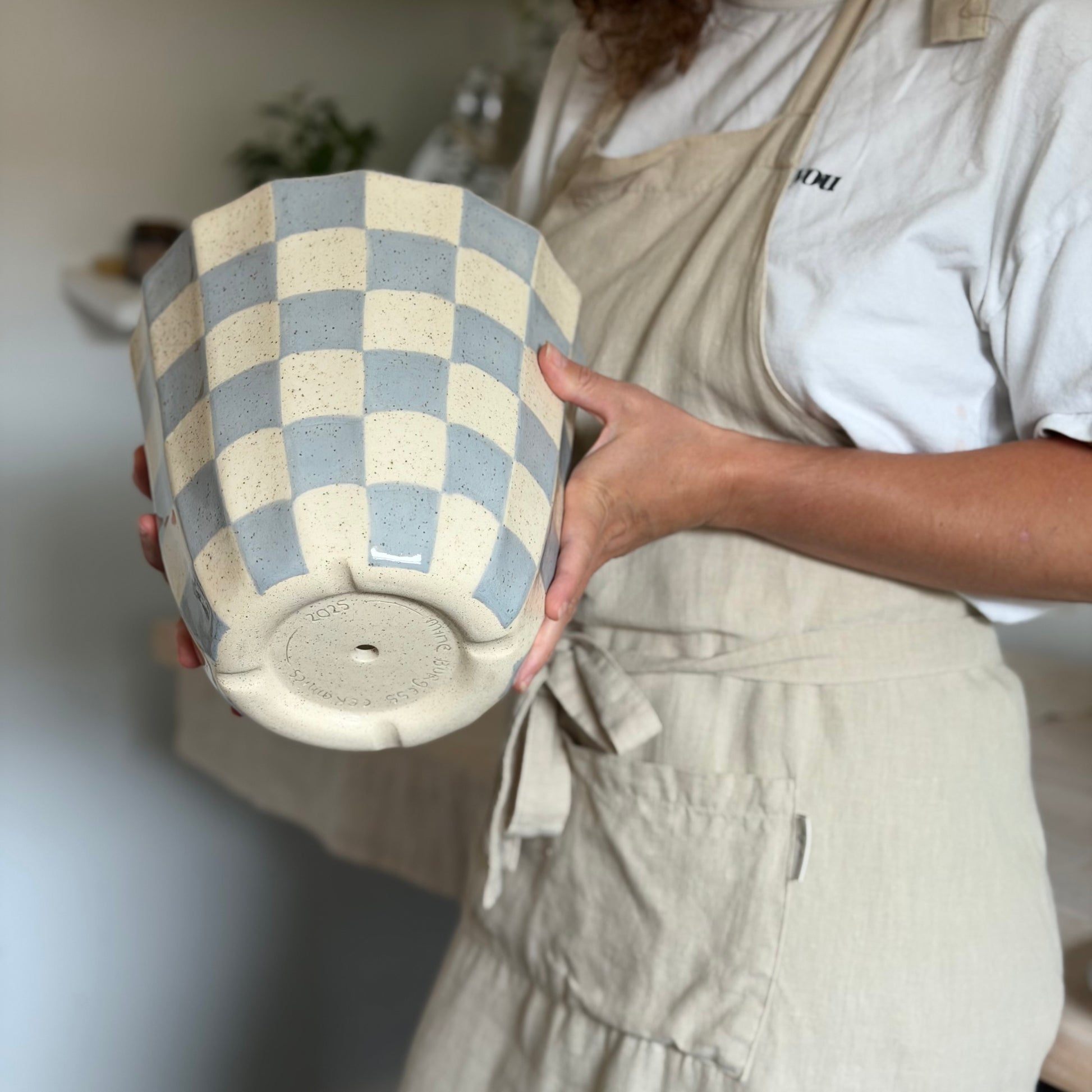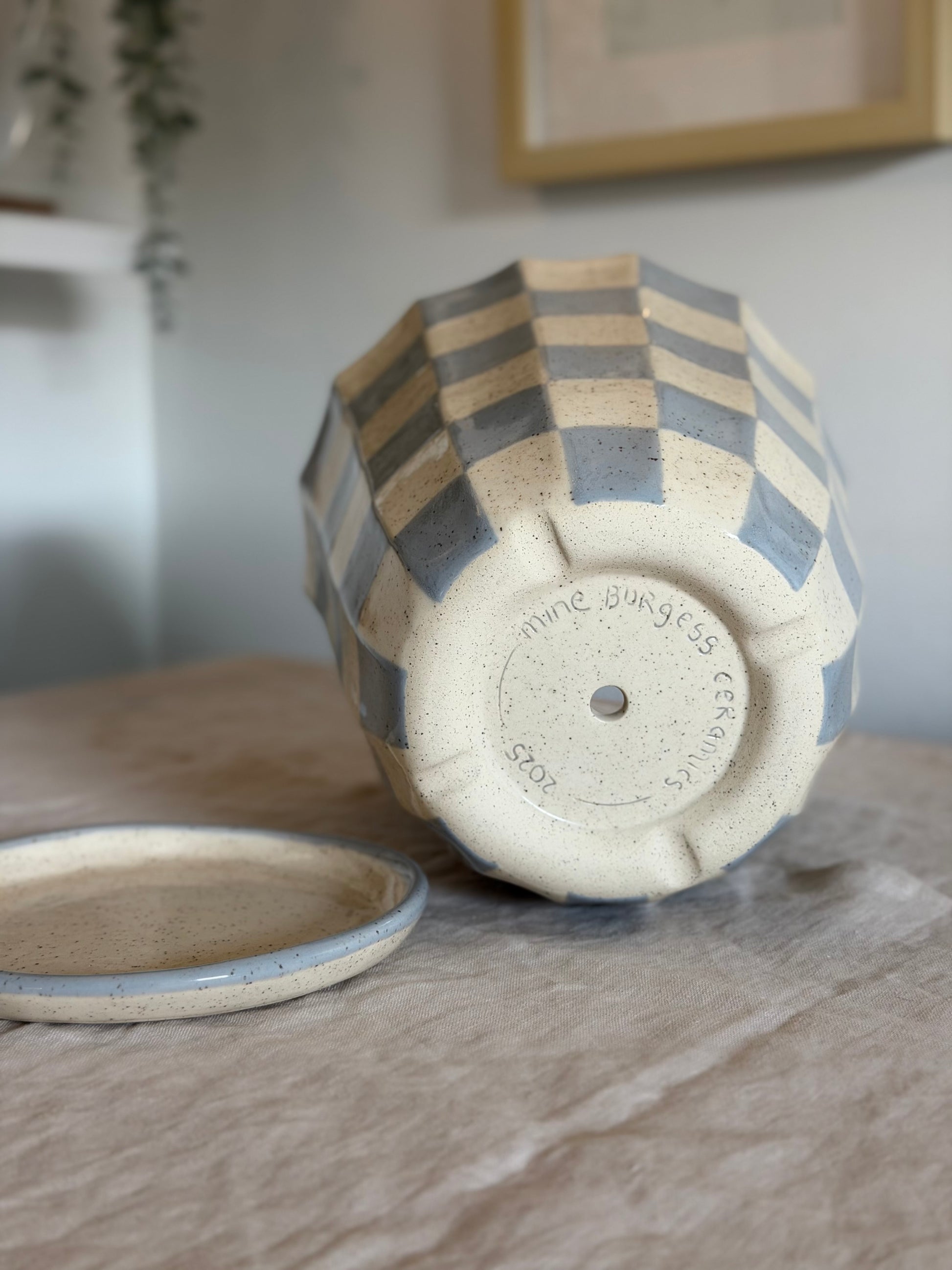 A handmade ceramic planter with a checker pattern in soft blue and cream tones. Crafted from stoneware, it includes a matching saucer and a drainage hole, ready for your favorite indoor or outdoor plants.